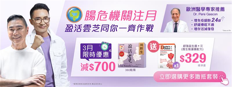 適逢3月大腸危機關注月,即日起至3月31日,「盈活雲芝」特別推出限時雙重優惠,助你雙管齊下激活免疫系統,減少腸道異細胞,降低換上大腸問題的風險,全面守護腸道健康。