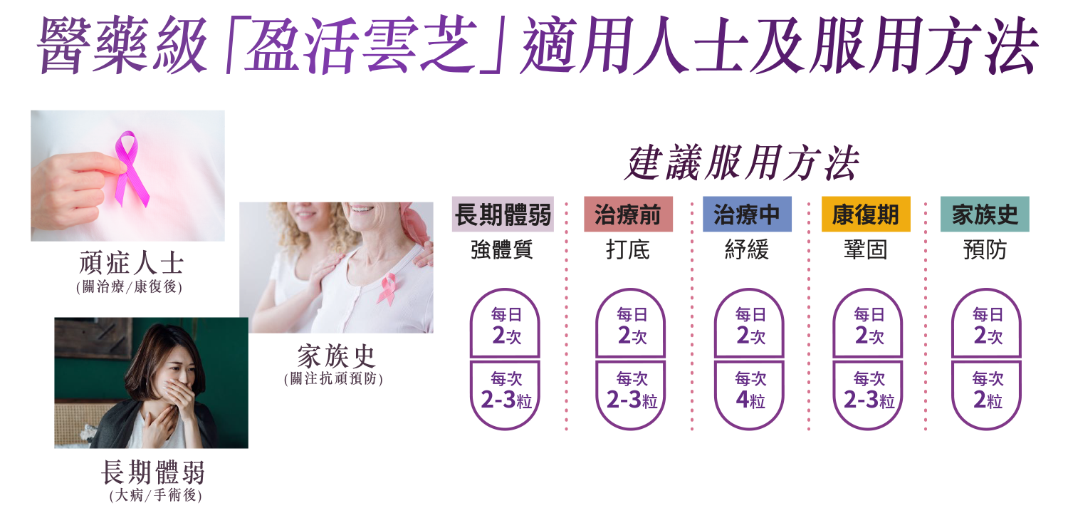 免疫系統強健是抗頑關鍵一環,維持免疫細胞健康正常, 不讓不良細胞有機可乘。而醫藥級 「盈活雲芝」 增免疫細胞可達2.4倍^,是抗頑各階段的重要 抗頑免疫後盾。